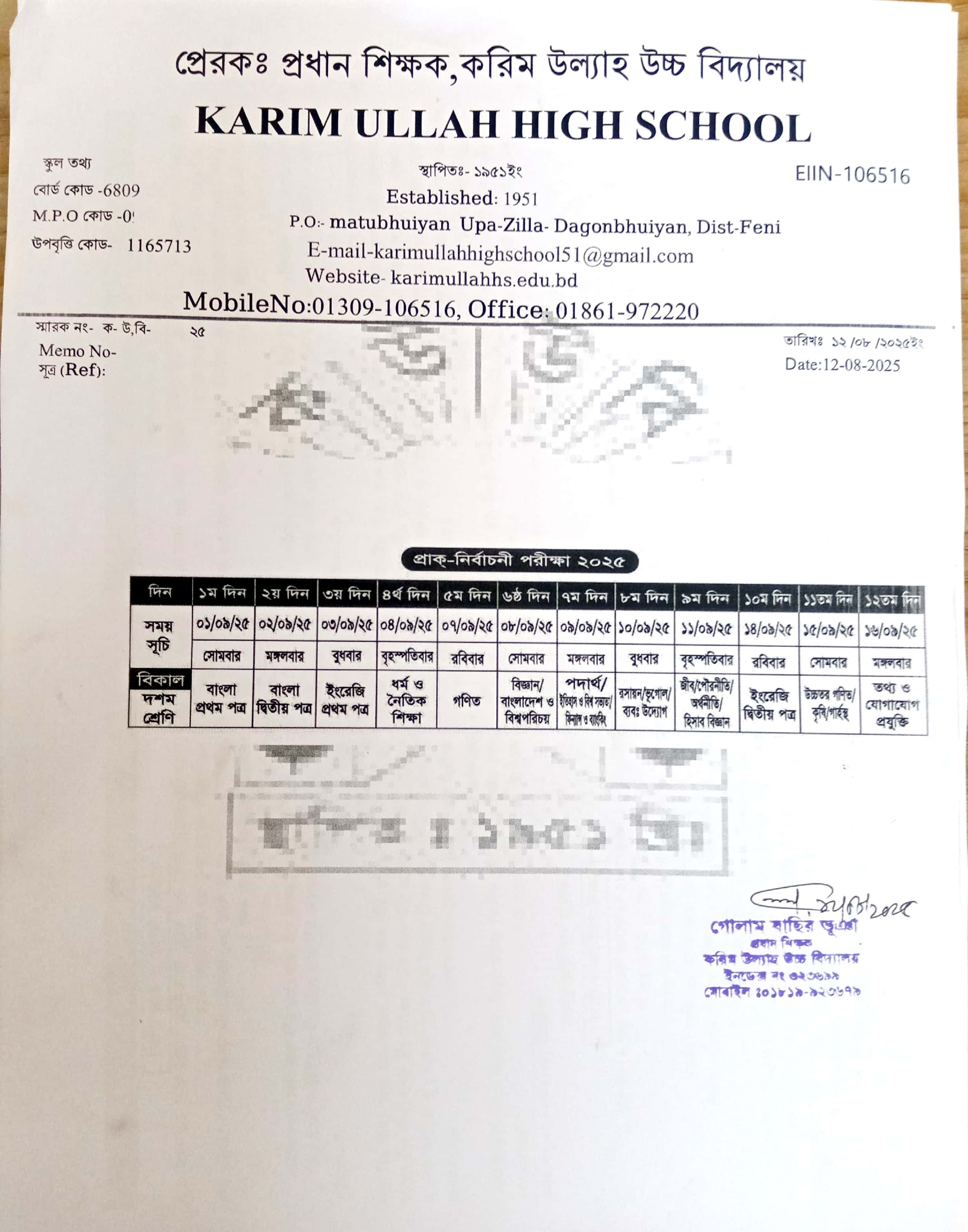 ১০ম শ্রেনির প্রাক- নির্বাচনী পরীক্ষা -২০২৫ এর সময়সূচী |
